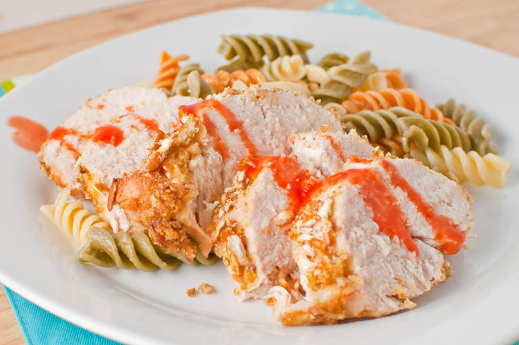Bake chicken until cooked through, about 30-40 minutes, depending on the size of your chicken breasts (ours were quite large). Slice and serve with some buttered pasta and Tabasco sauce (couldn't resist the added heat!).